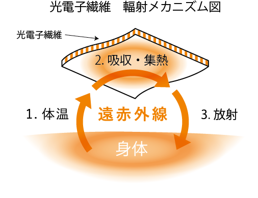 光電子®の繊維に含まれる微粒子セラミックスが、身体が発する遠赤外線を吸収・集熱。それを放射して身体へと送り返す循環によって、ポカポカの暖かさをキープする。〝保温〞なので、発熱などの〝加温〞繊維のように暑くはなりすぎず、自然で快適な温もりを実感できる。