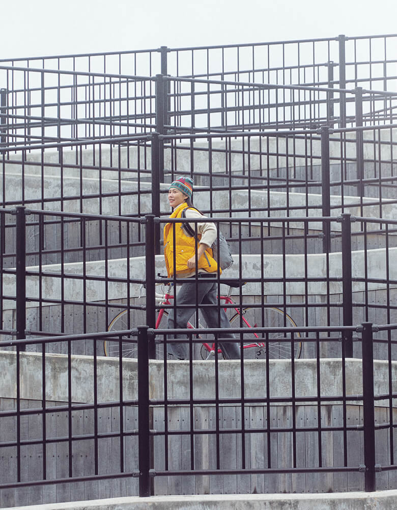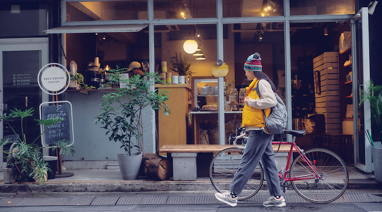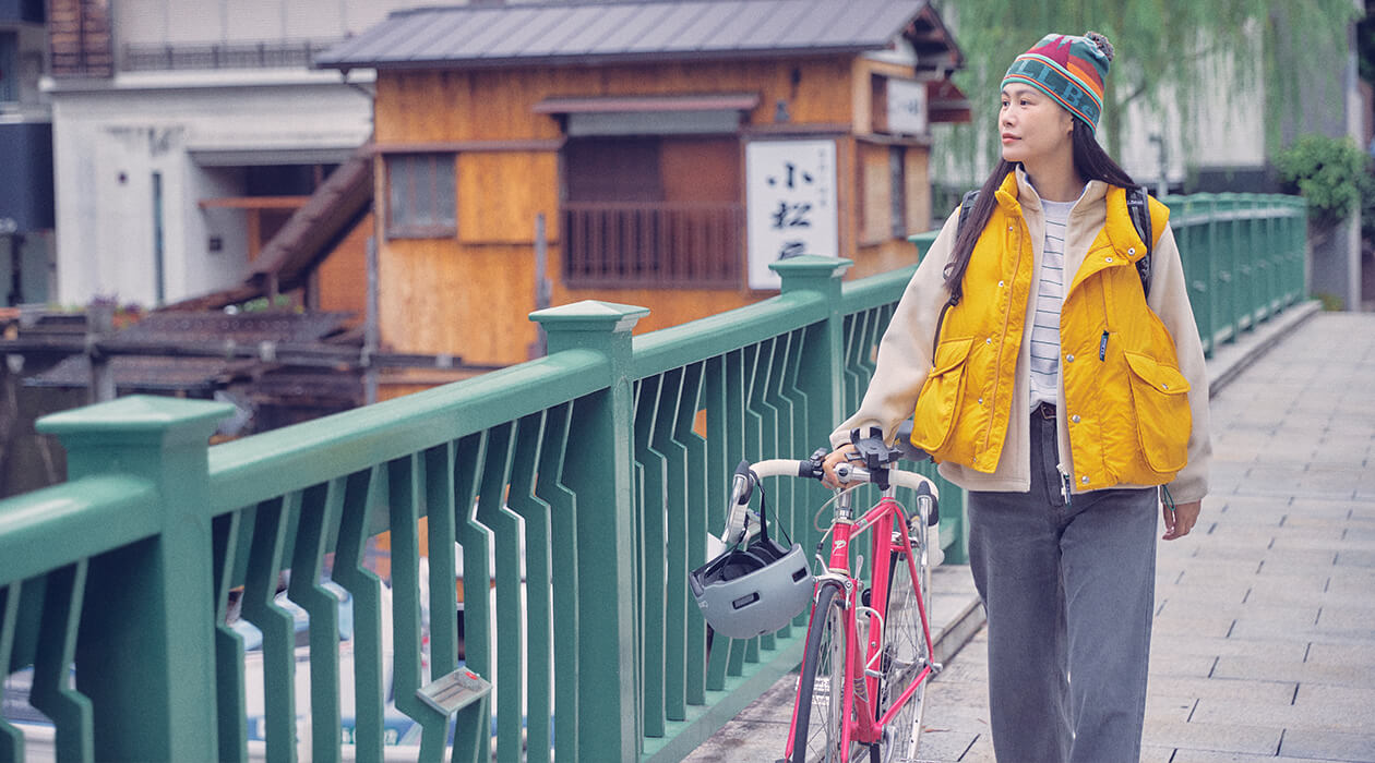 普通のダウンとは違って、自転車を漕いでも暑くなりすぎないところが嬉しいですね。機能はハイテクなのに見た目はクラシックなデザインだから、自転車を停めて街を歩くときも、お店に入ってもお洒落に馴染みます。