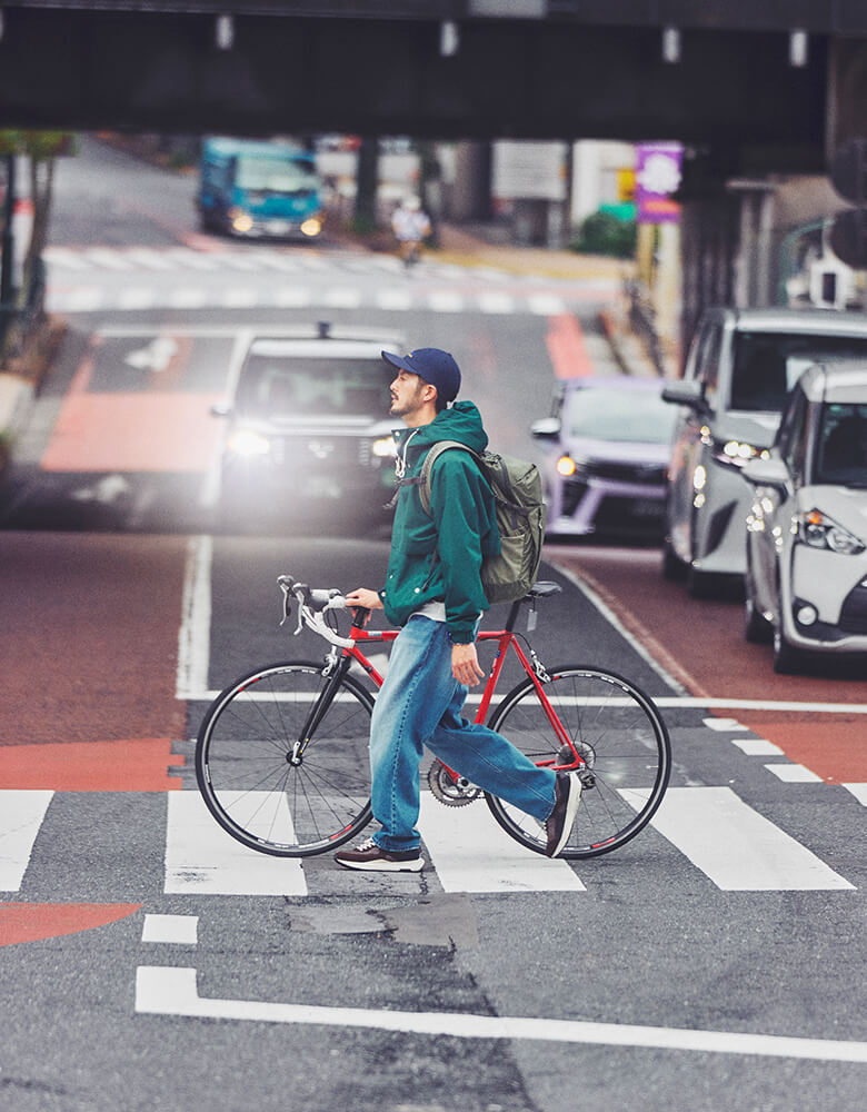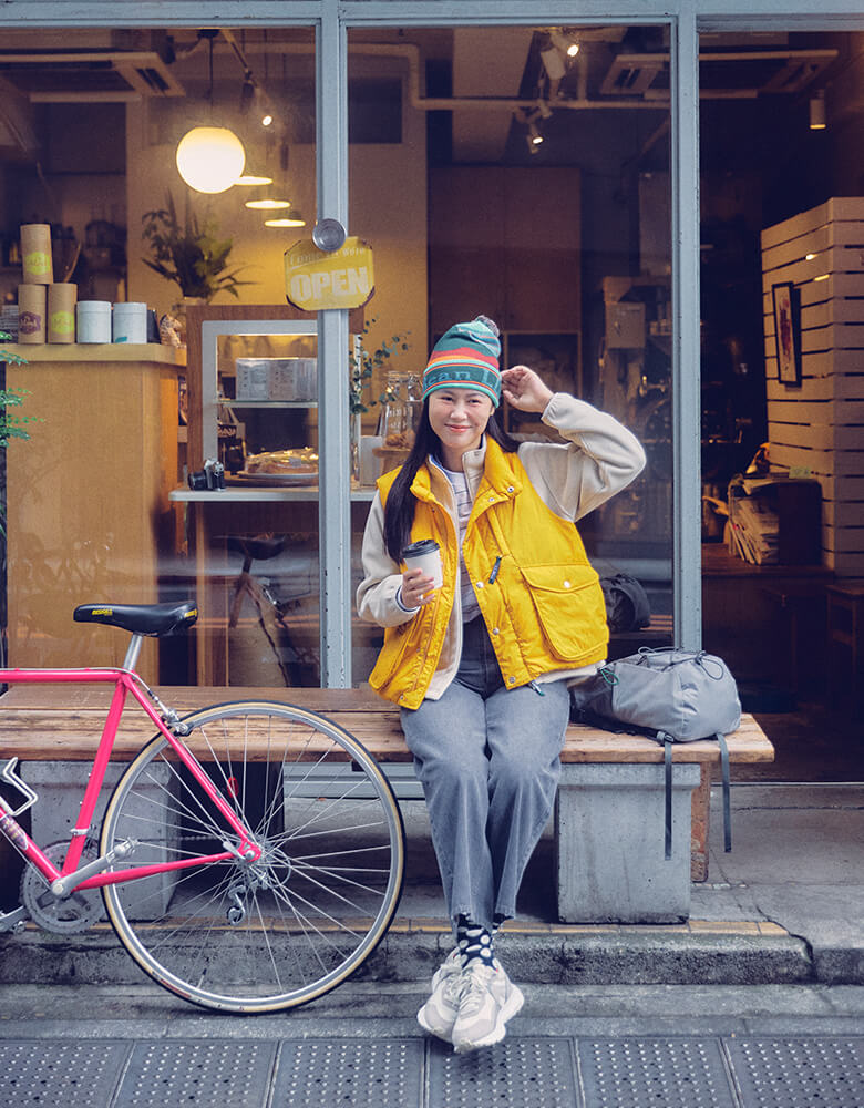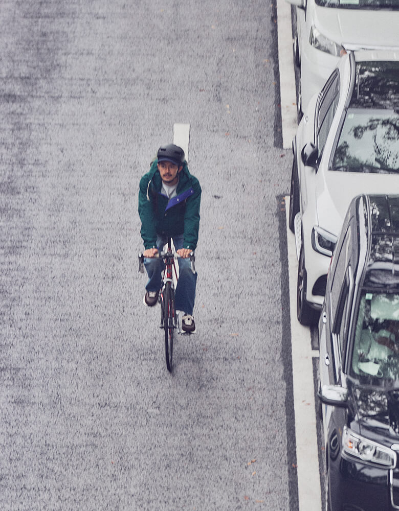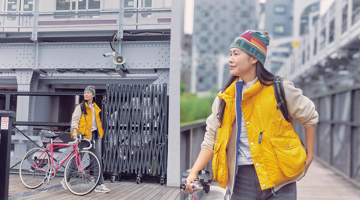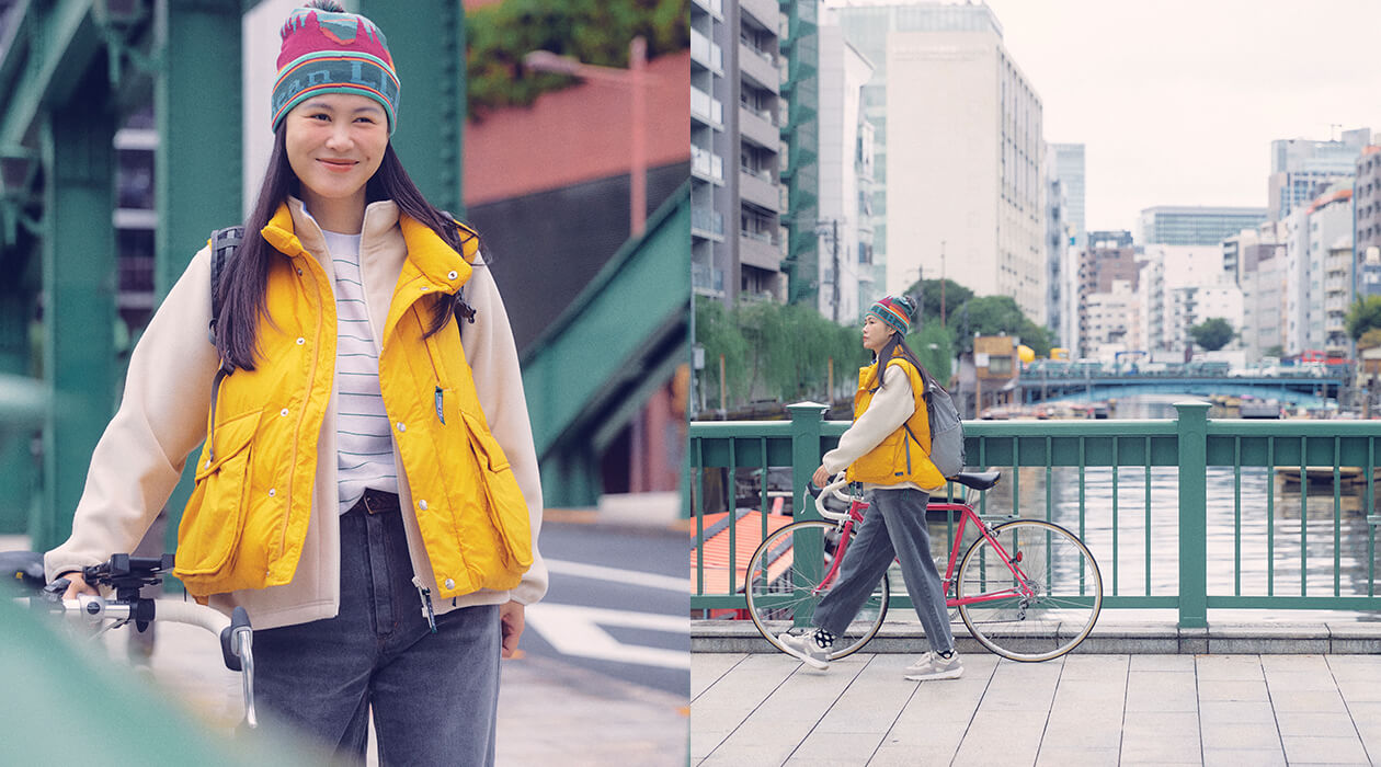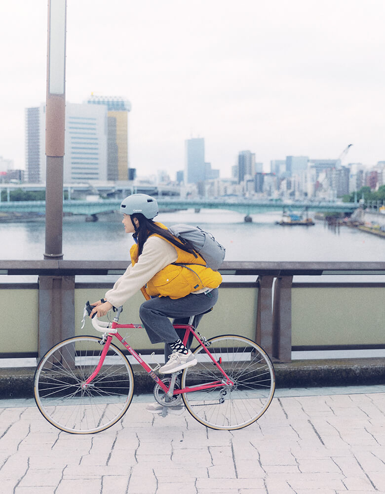 もともとアウトドアウェアが好きで日常的に街使いしているから、自転車に乗るときも変わらず着ています。