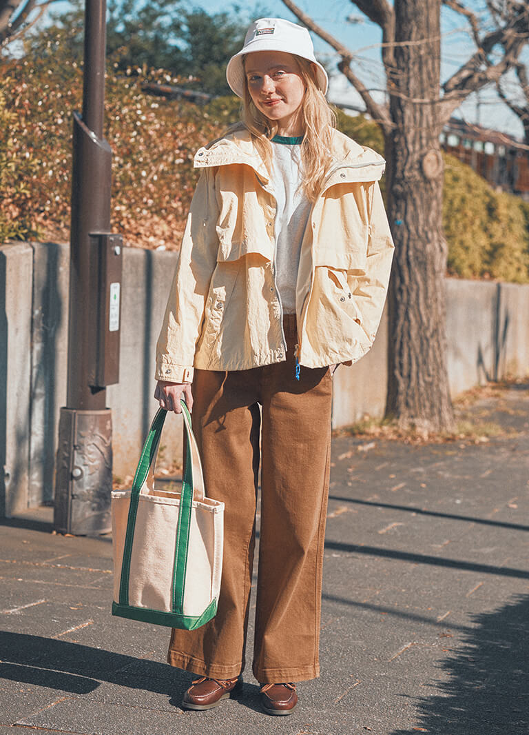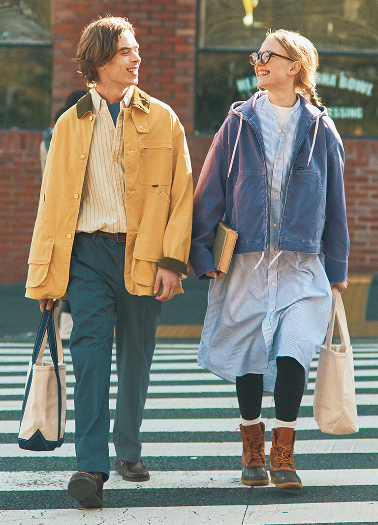 気になっていた彼とバッタリ。着こなしが《エル・エル・ビーン》でおそろいだなんて、ハッピー! 日本のデザインチームが手掛ける「ジャパン エディション」のフーディジャケットは、Aラインシルエットと、古着のようなエイジングが自慢。いつものシャツワンピースに重ねるだけで、アジのあるスタイルを叶えてくれるのです。