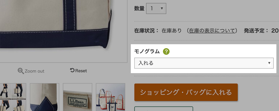商品をショッピング・バッグに入れる前に、【モノグラムを入れる】をチェックしてから、【ショッピング・バッグに入れる】ボタンを押すと、次のモノグラム(イニシャル刺繍)指定画面でモノグラムのスタイル、文字などを指定できます。