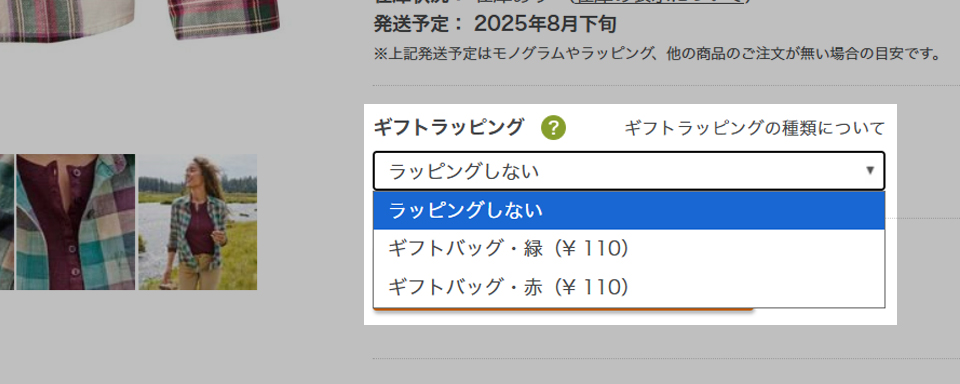 商品をショッピング・バッグに入れる前に、【ギフトラッピング】ボタンを押すと、ギフトバッグの種類を指定できます。