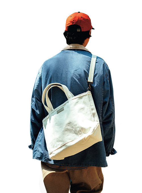 くたくたになるまで付き合いたいタフなトートバッグは、白をチョイス。キャンバス素材は、過ごした時間が味わいとして刻まれるのがいい。新作は取り外し可能なショルダーストラップ付きで、自転車移動のときにも頼れる存在。