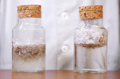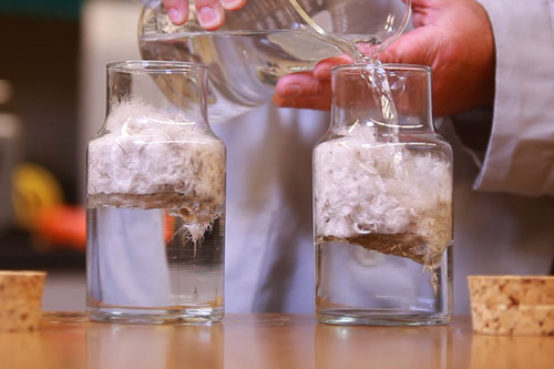 従来のダウン(左)とダウンテック™ダウン(右)に水を注いでシェイク。従来のダウンは水を吸ってかさが減ってしまいますが、ダウンテック™ダウンは乾燥した状態を維持しています。これが、暖まった空気を逃がさず、保温力が続く秘密です。